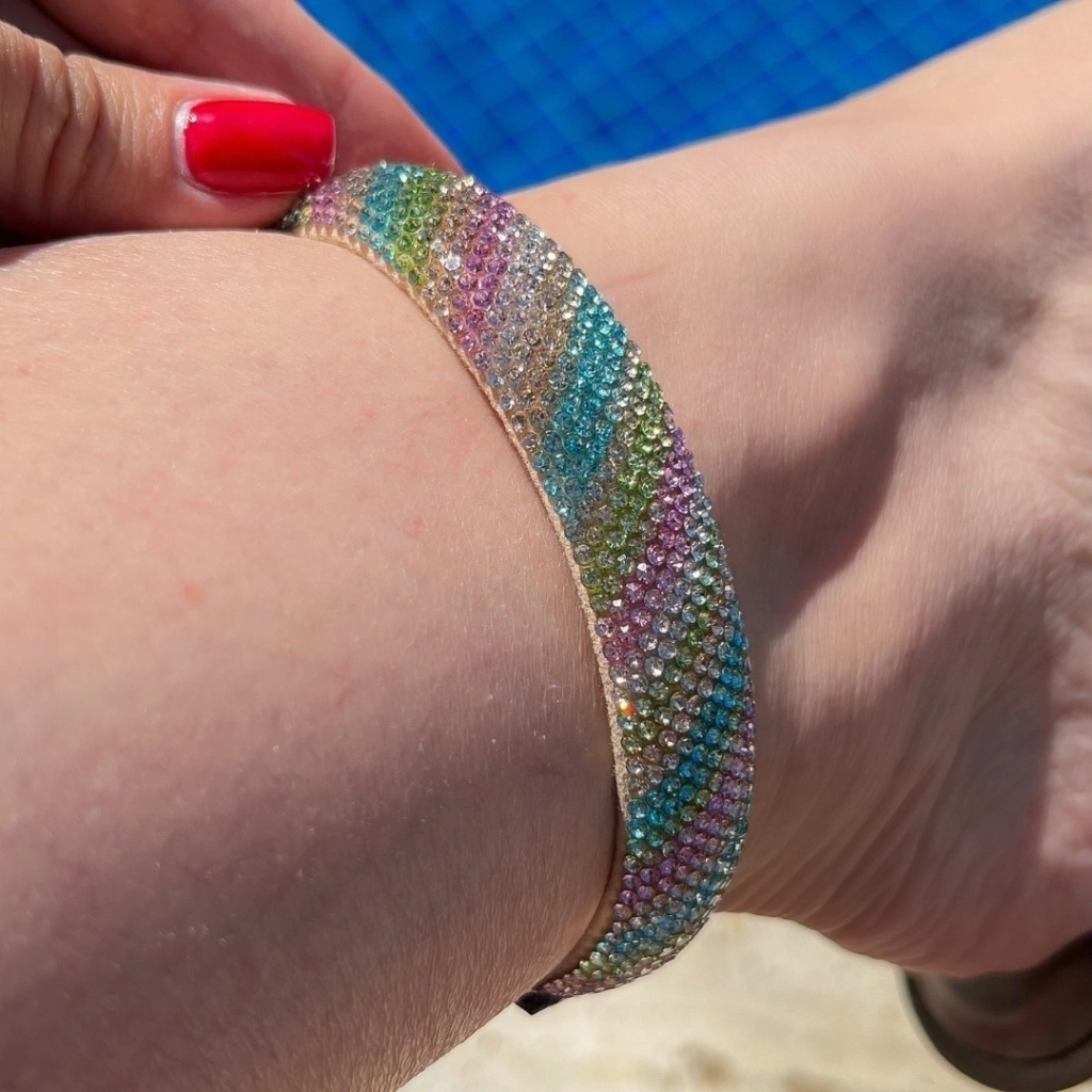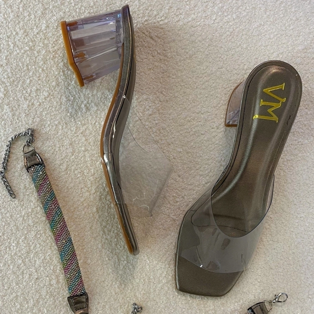 TAMANCO CONFECCIONADO EM MATERIAL METALIZADO FOSCO NA PALMILHA E TIRA EM VINIL TRANSPARENTE CRISTAL. TORNOZELEIRA TODA CRAVEJADA EM PEDRARIAS COLORIDAS COM FECHO E CORRENTE QUE ADAPTA-SE A QUALQUER TORNOZELO. SALTO EM ACRILICO NA ALTURA DE 6 CM. SOLADO EMBORRACHADO. MODELO FABRICADO SOB ENCOMENDA E POSSIU PRAZO DE 10 DIAS ÚTEIS PARA SER ENVIADO MAIS PRAZO DE ENTREGA.