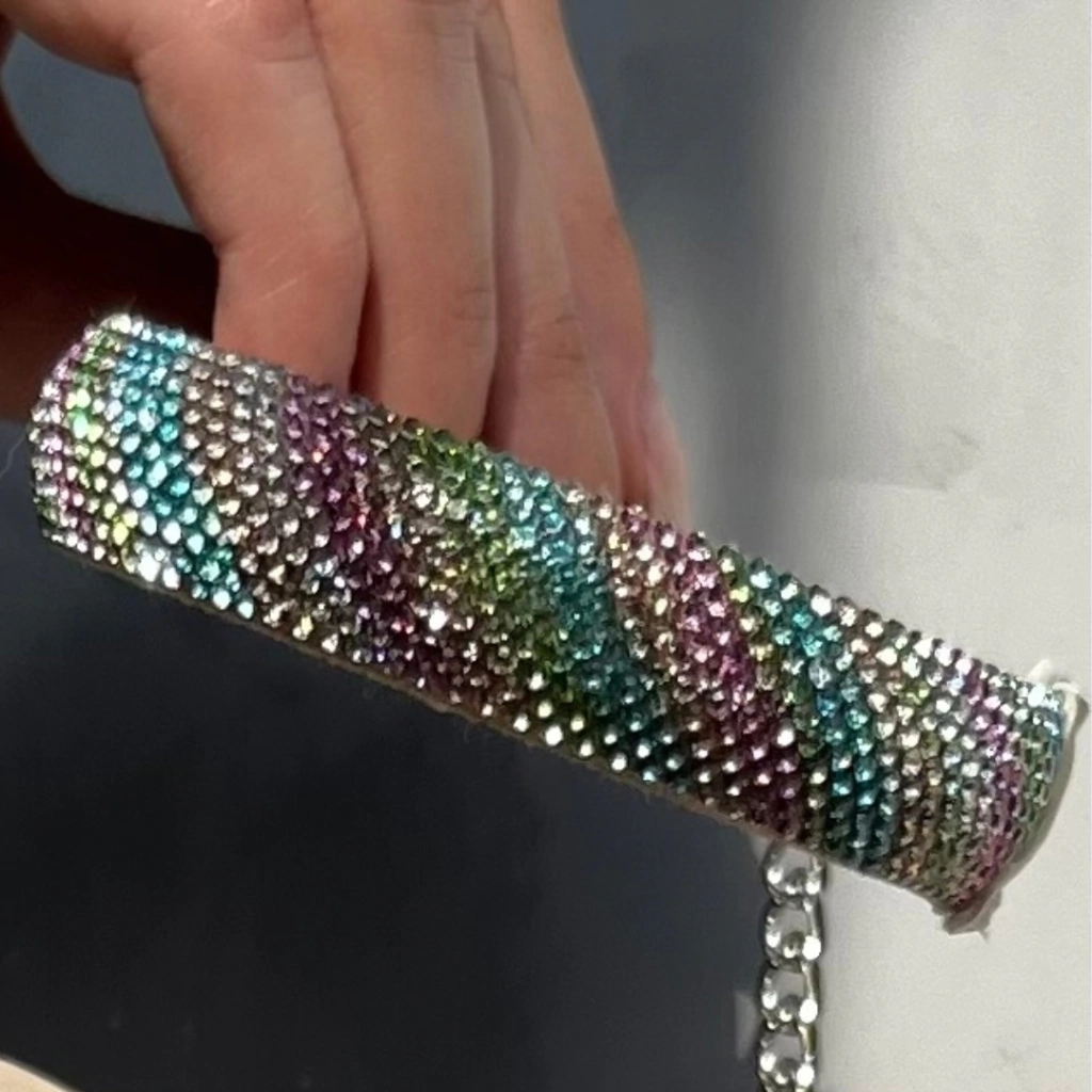 TAMANCO CONFECCIONADO EM MATERIAL METALIZADO FOSCO NA PALMILHA E TIRA EM VINIL TRANSPARENTE CRISTAL. TORNOZELEIRA TODA CRAVEJADA EM PEDRARIAS COLORIDAS COM FECHO E CORRENTE QUE ADAPTA-SE A QUALQUER TORNOZELO. SALTO EM ACRILICO NA ALTURA DE 6 CM. SOLADO EMBORRACHADO. MODELO FABRICADO SOB ENCOMENDA E POSSIU PRAZO DE 10 DIAS ÚTEIS PARA SER ENVIADO MAIS PRAZO DE ENTREGA